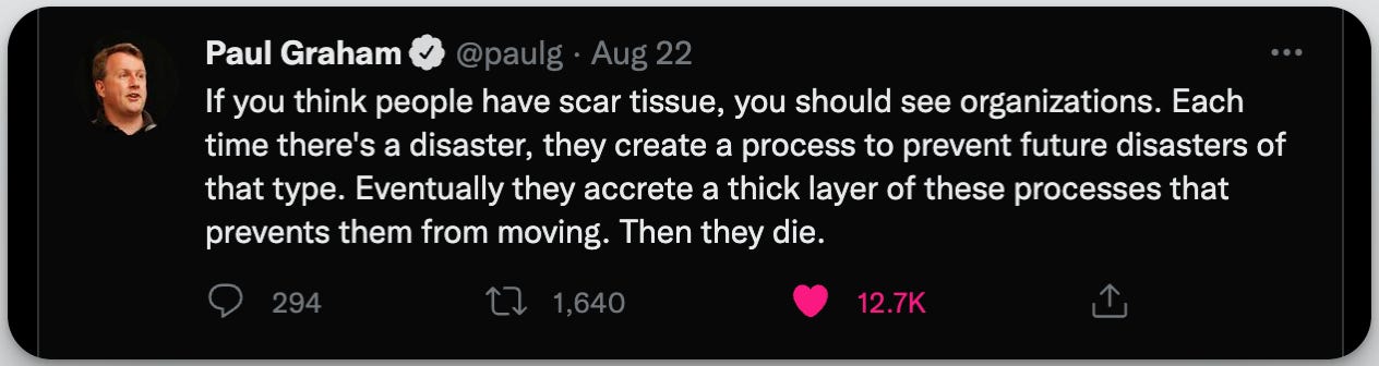 Startups don’t have any thick accumulated scar tissue slowing them down.