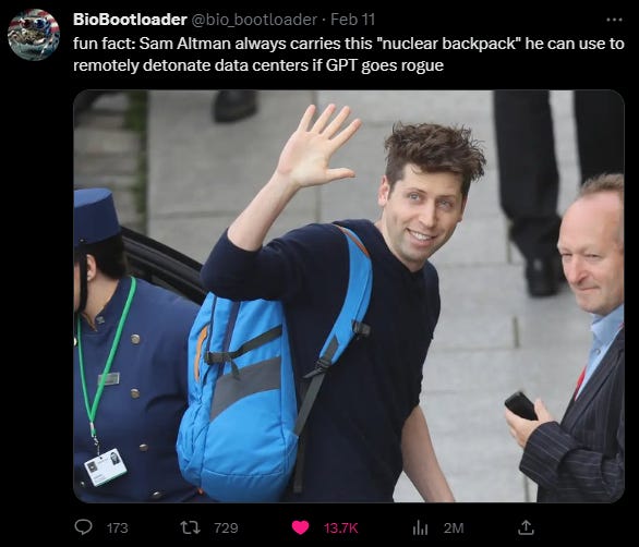 This tweet is funny because this week, it was reported that Sam Altman, the CEO of OpenAI that invented ChatGPT, is a Doomsday prepper.