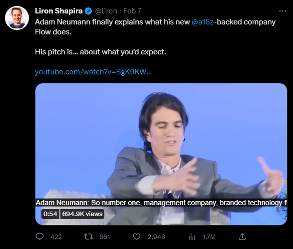 This was a fun clip to watch. And I unfortunately suspect that Adam Neumann’s pitch might’ve been fine in the easy money era but he might be in for some tough times in the post easy money era.