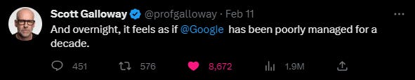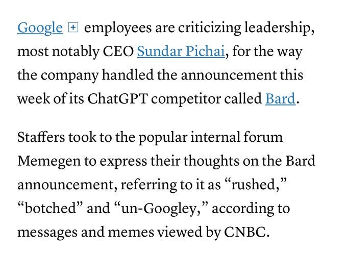 And Satya Nadella and Microsoft are throwing additional salt in the wound; Satya declared this week that Bing does not need to generate a profit, unlike Google, whose main business is search. Bing just needs to break even and so they can afford to scale ChatGPT and OpenAI because they make plenty of money in other places.