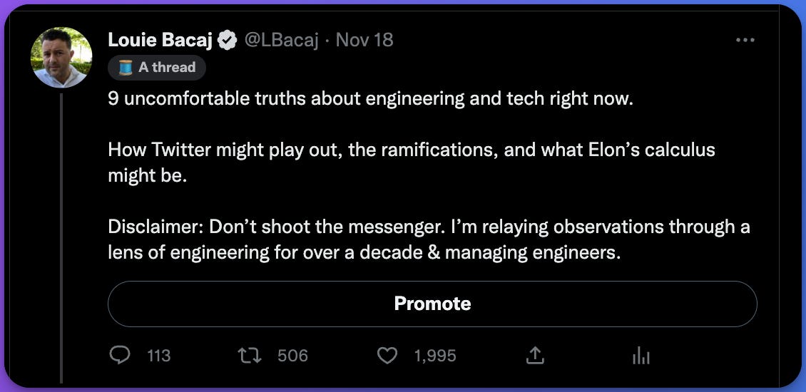 This week I wrote a thread about the ramifications of Elon Musk pushing out over 90% of the workforce at Twitter. In the thread I said that Big Tech would never be the same if he succeeds. There will be massive pressure on CEOs from shareholders to downsize.