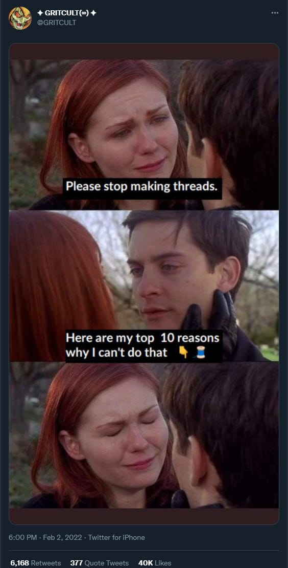This Meme is awesome not only because people are writing too many Twitter threads but also because my brother and I are placing a Small Bet by building a Twitter Thread writing tool designed for people to get feedback on threads.