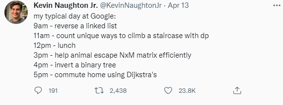 Kevin is a former Google engineer, and this Meme tweet resonated because he's mentioning many of the questions folks are asked to code on whiteboard interviews. But that they rarely end up actually ever coding day to day on the job, mainly because they rely on libraries that have them already coded.