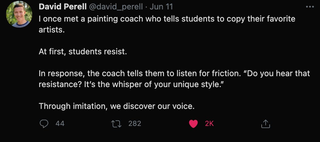 One of the best ideas from David Perell is to copy others whose work you admire. We will never be able to do it perfectly and those imperfections are our own style, our voice coming out. He expands on this idea in this video.