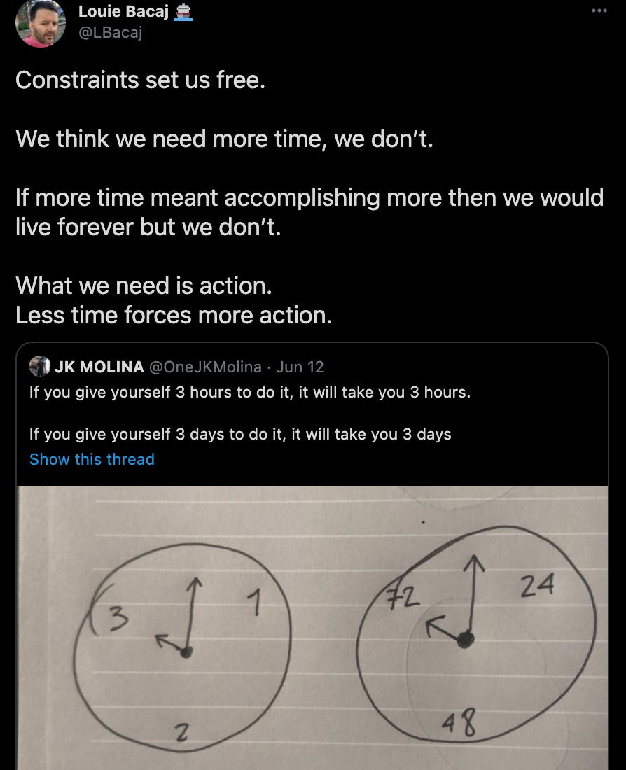 We need constraints in our lives, even if they are artificial, they will force us to accomplish so much more. I took the Ship30 challenge to fully internalize this, having only a day to ship an essay sounds like a terrible constraint. It's not, it forces great work. When I had more time, I wasted it.