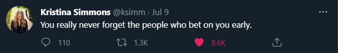 Kristina reminds us that we never forget the people that bet on us early. Which of course I never do, I keep in touch with all of those people and I always make sure they know how grateful I am. But this also serves as a reminder to bet on other people, even when they are just getting started, they will never forget it.