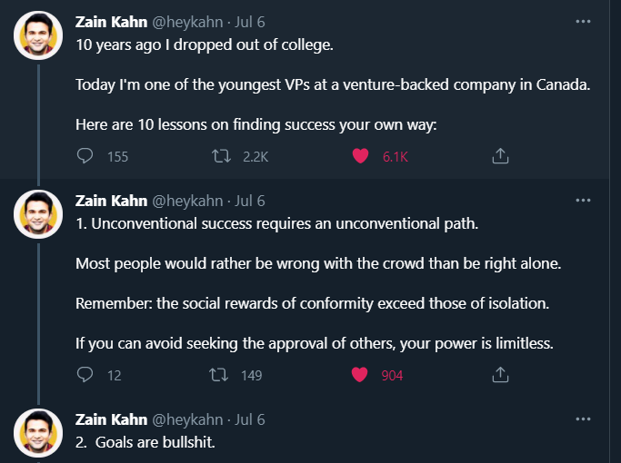 One of the best Twitter threads I have come across in a while comes from Zain this week who shared his story and his learnings from the last few years. Do give it a read, it's very unconventional but all incredibly true.