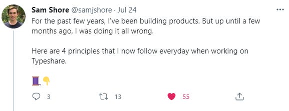 A great thread from Sam, on how to build products that succeed. I especially love the Validate before building and Ruthless prioritization, you cant afford to build the wrong thing when you are small.