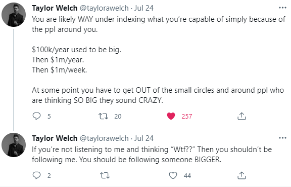 Taylor in this Tweet puts the idea of "Show me your friends, and I'll show you your future" in another way. Change your circle and change your life.