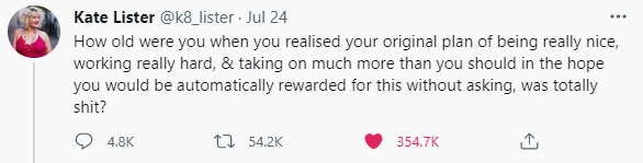 This Tweet from Kate is a great reminder that the old conventional wisdom of blindly working hard will stop paying off at some point. It took this last year to really help me internalize this. We need leverage, ownership, and to work on things that compound. Blindly working hard at the things that will taper off makes no sense.
