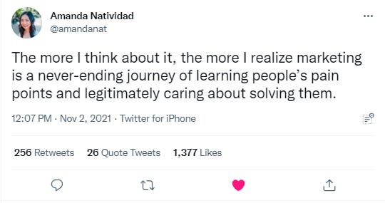 Amanda has been dropping some amazing knowledge on twitter and this tweet is no exception. Since taking Write of Passage Cohort 6 with her earlier this year, it has been amazing to watch her growth. An example of what showing up will do.