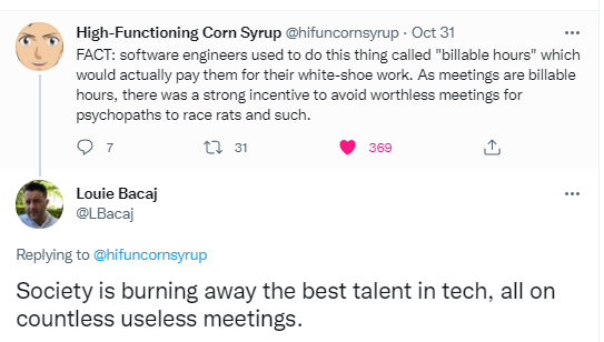 I am convinced that this is happening across all of industry right now. It's not just true for engineers. The culprit is work from home. But big companies had a problem with too many meetings even before work from home. But now its far worse. People are constantly forced to meet synchronously, burning away each other's time and willpower.